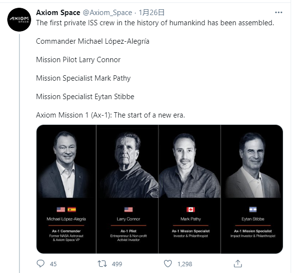 2、Axiom Space公布首飞名单 5500万美元一张船票
