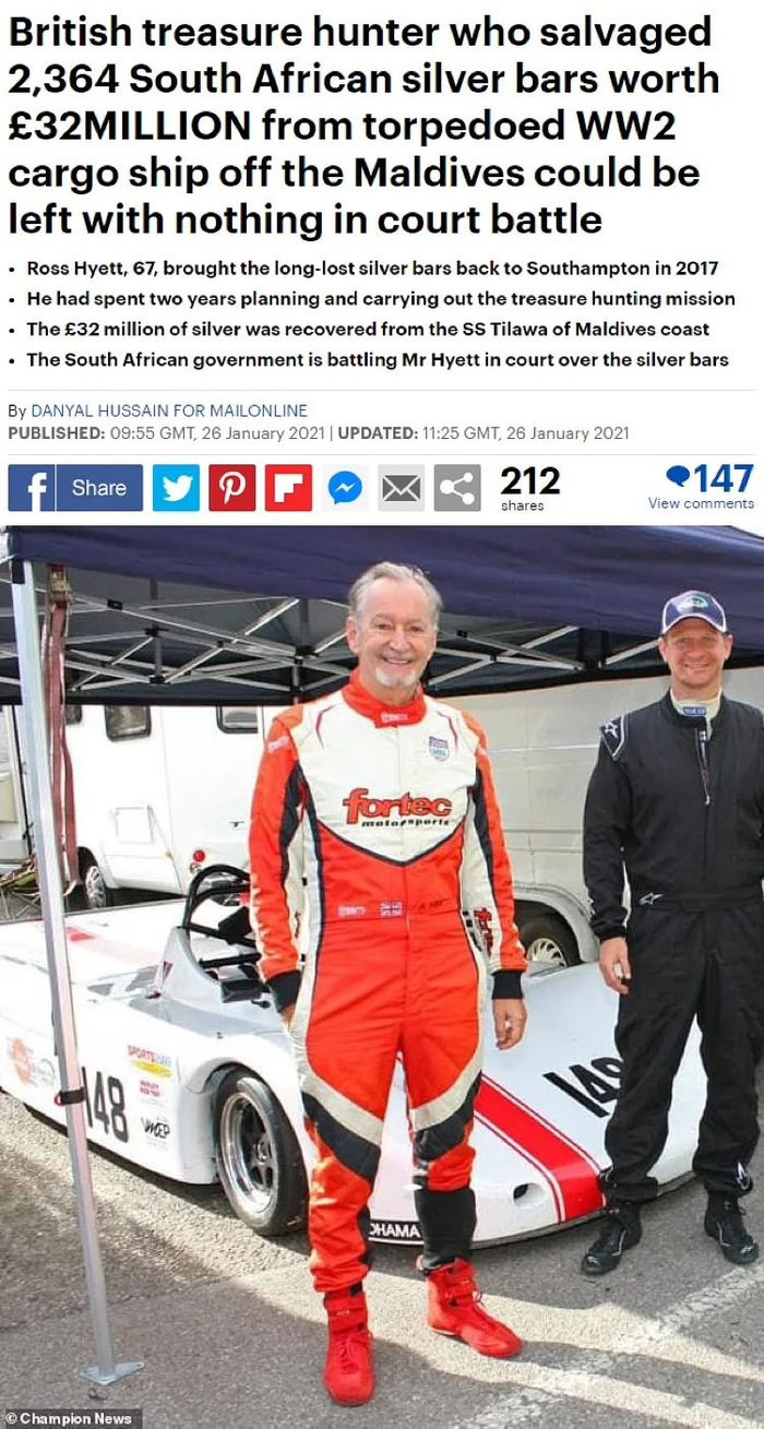 据悉,这艘船在1942年准备向驶南非,当时搭载了954人以及南非政府购买的2364根银条和其他货物,但却在马尔代夫沿海被一艘日本潜水艇发射的鱼雷击沉。海耶特表示,除非南非政府支付他一笔巨额“打捞款”,否则他不会将银条拿出来,但却遭到了南非政府的拒绝,这也就意味着如果南非政府胜诉,海耶特将一无所获。