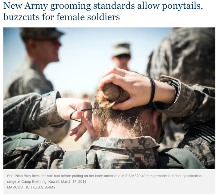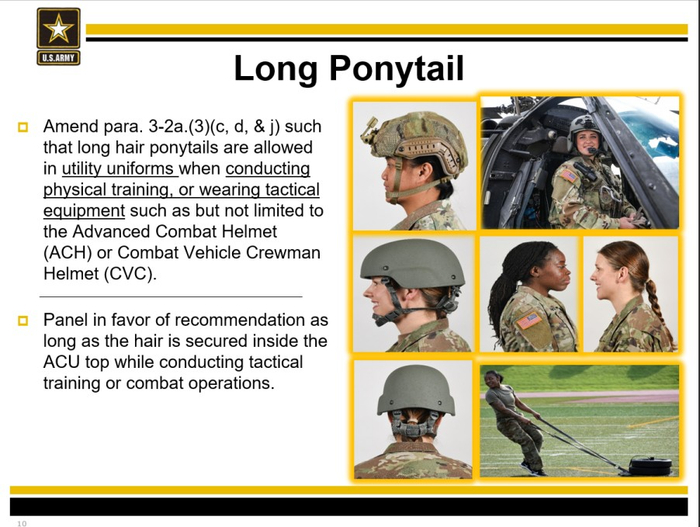 陆军布莱恩·桑德斯少校表示,修改这些规定考虑了多种因素,包括文化,健康和安全问题。他说,军方以前要求的紧绷的盘发可能会导致某些女性脱发和其他头皮问题。过于浓密的头发盘在头上体积更大,会影响头盔的使用,并可能损害良好的视力。