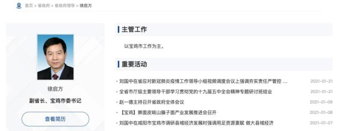 2017年6月,徐启方任宝鸡市委书记,1年后(2018年7月)履新陕西省副省长,兼任宝鸡市委书记。徐启方是陕西省排名第四的副省长。