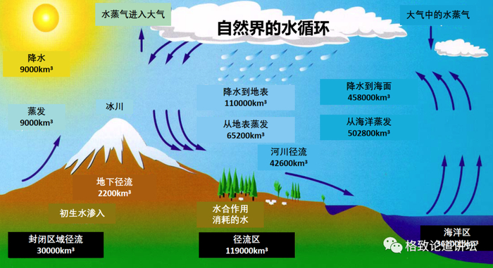 经过这些循环之后,千流归大海,这是我们看到的地球表面的水循环过程。