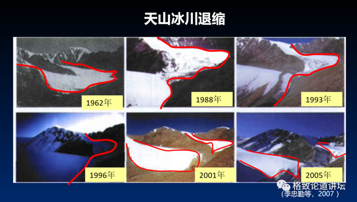 但是南疆的响应更强烈,那再追到天山一号冰川,一号冰川在过去50年退缩了差不多15%左右。