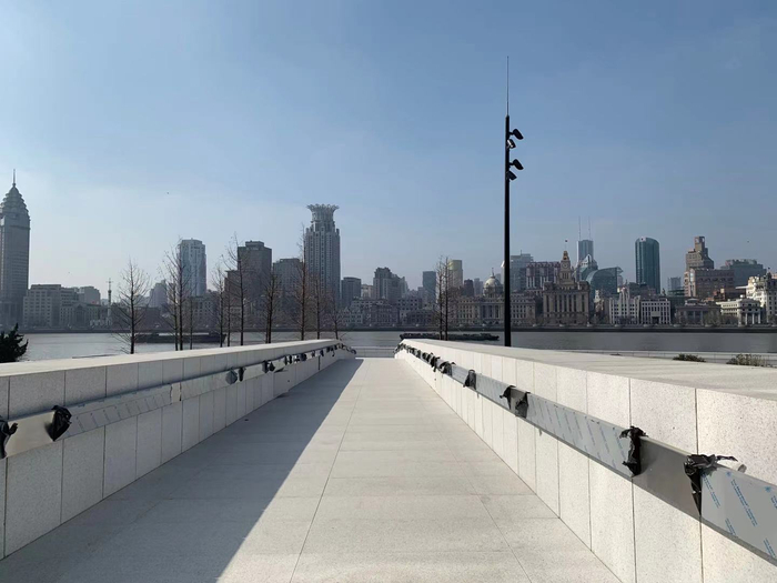 浦东美术馆天台。林易锴 图 在美术馆2楼,一条通往滨江的白色廊桥,拓展了“领地”的视域,走在其上让人联想到泰特现代美术馆外泰晤士河上的千禧桥,面对黄浦江水与万国建筑群,似乎穿越时代,穿越地域,连接着东西、过去和未来。