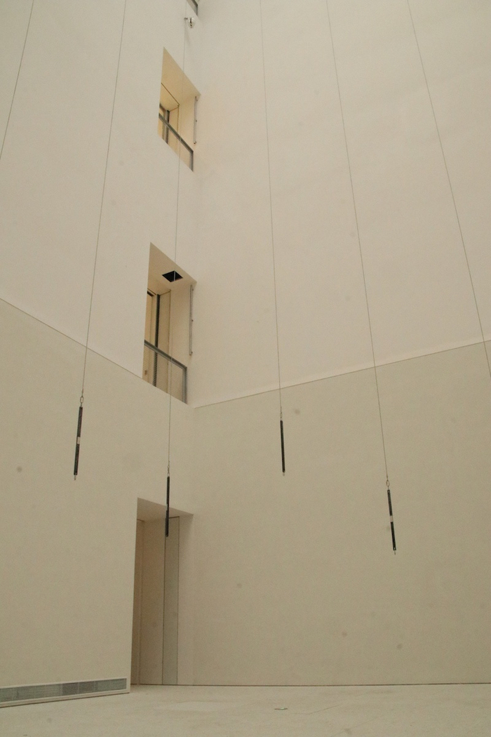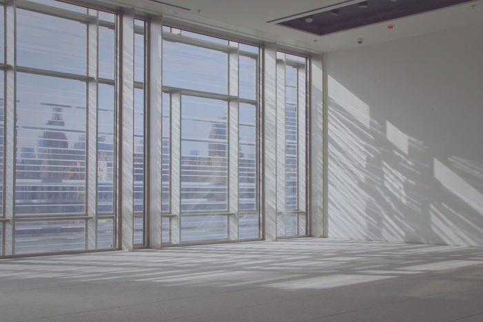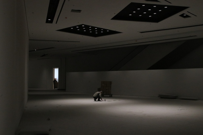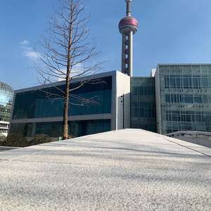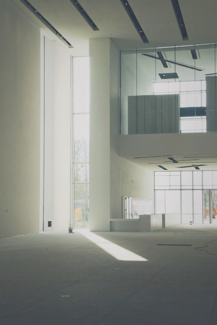 在让·努维尔为世界各地设计的建筑中,光是其重要的造型要素。浦东美术馆也不例外,“一些屏幕”可以直观理解为“镜厅”的大屏幕,可以更广泛的理解为“玻璃”。这也是让·努维尔擅长运用的建筑元素,在目前尚空无一物的白色空间中,大小不一、点缀其中的玻璃沟通了美术馆内外的空间,玻璃外的陆家嘴和外滩风光在展品未进入之前,如同风景画一般存在于展厅之中。