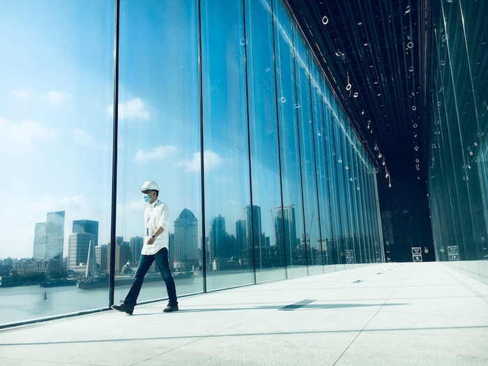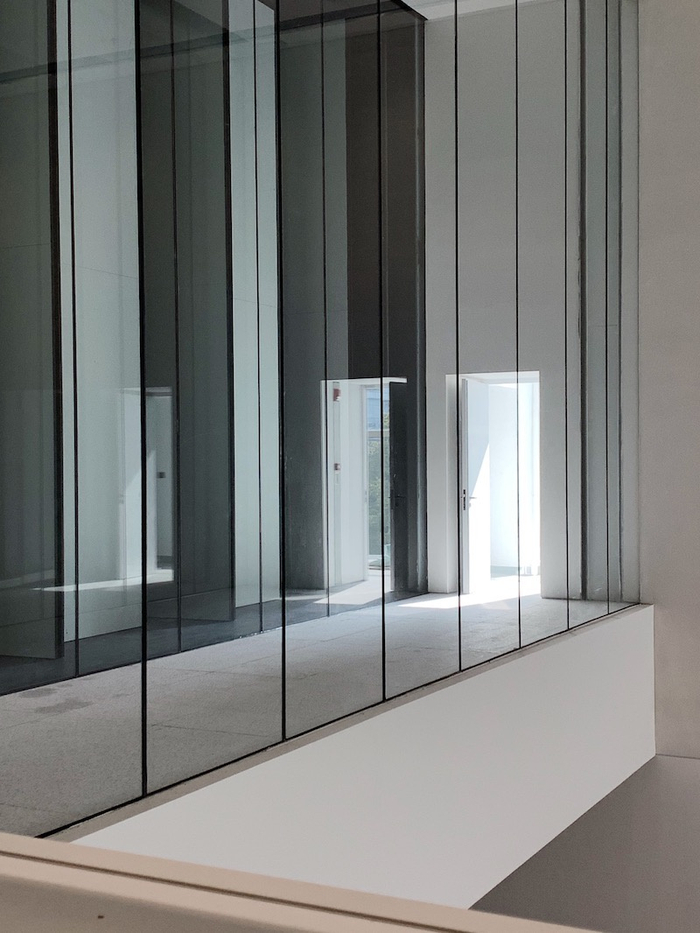 玻璃 ”,在与之相隔约5米的内部还设有两块相似面积的镜面显示屏。两层、两道巨型玻璃构成了美术馆2楼和3楼两个宽55米、深5米的“镜厅”。走在由两面玻璃构成的展厅中,叠加镜面反射出静态的外滩万国建筑、黄浦江上缓缓移动的船只,以及展厅中人的活动。