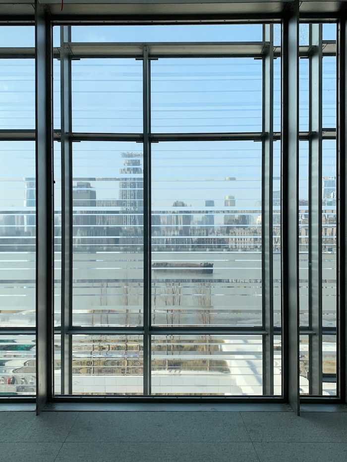 同一面窗户,不同时间不同光线额映射。澎湃新闻 图 建筑外立面的玻璃也并不相同,从外观看,带着些许雨纹,让人想起上海季节性的多雨天气;从内向外看,玻璃似滤镜,横竖之间将对岸的万国建筑做了艺术的解构。