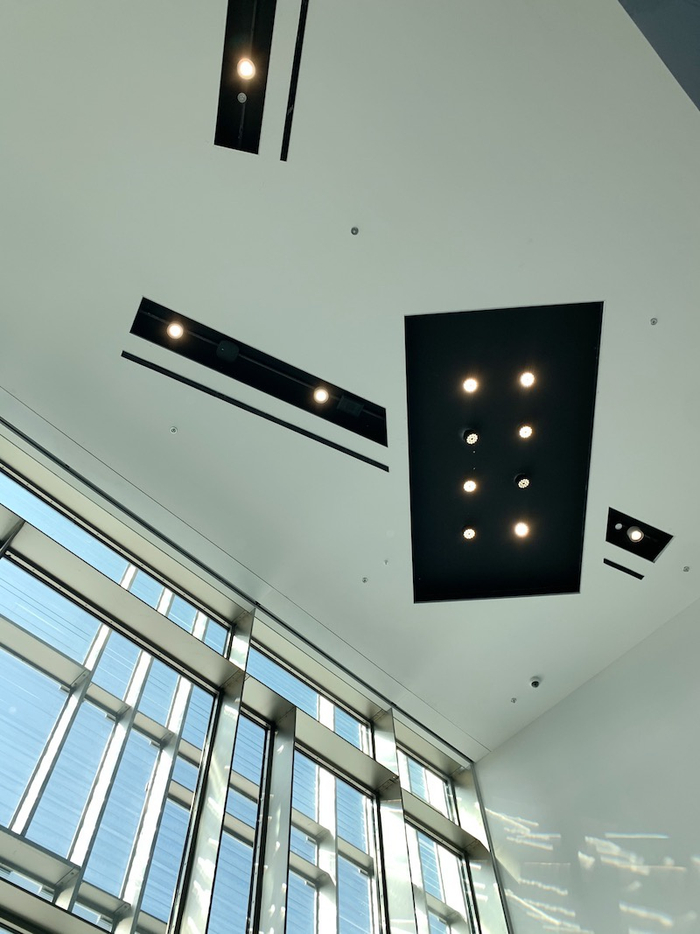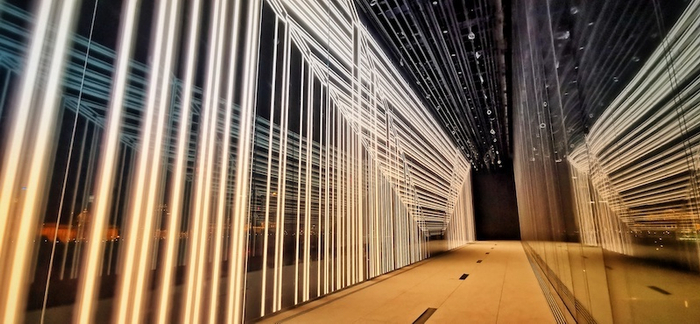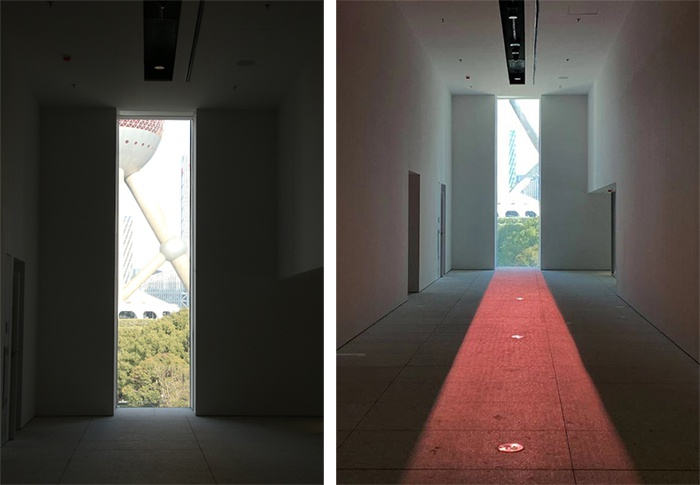 浦东美术馆内部,玻璃与光构成的景观。林易锴 图 以玻璃引入光,在几何图形、光线、空气的互相作用下,大自然的偶然性也透进了展厅,带来无穷的变化。在澎湃新闻记者探访时,看到一束红光从玻璃外透进来,探寻红光的来源,发现是太阳刚好照在东方明珠底部大球的红色玻璃区域,再透过美术馆的玻璃,投射到地面上,惊异于这瞬间的精妙,匆匆按下照片,当回头再走过这一区域,红光退隐,恢复如常。类似这样光的协奏,也时常发生在美术馆的各个区域,只是因为时间、天气、光线、季节,观者的心境的不同,投射出不同的景象。