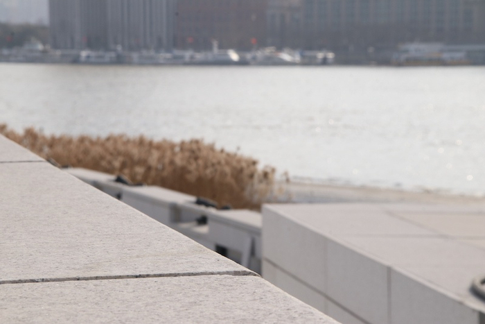 浦东美术馆所用的材料,山东白麻大理石。林易锴 图 “领地”是白的,“一种材料”——山东白麻大理石将白色领地勾勒而出,无论是美术馆外部墙面、天台,廊桥、花园,还是内部地面和墙面使用的均是这种石材,只是通过不同的打磨方法,构建出不同的质感。