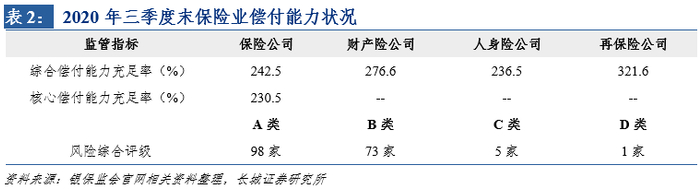 从银保监会发布的2020年三季度末保险行业偿付能力情况上看,核心偿付能力充足率和综合偿付能力充足率指标都远远超过了最低标准。风险综合评级出现了6家不达标公司,分别是C类5家:长安责任、渤海人寿、百年人寿、前海人寿、君康人寿;以及D类1家:中法人寿。