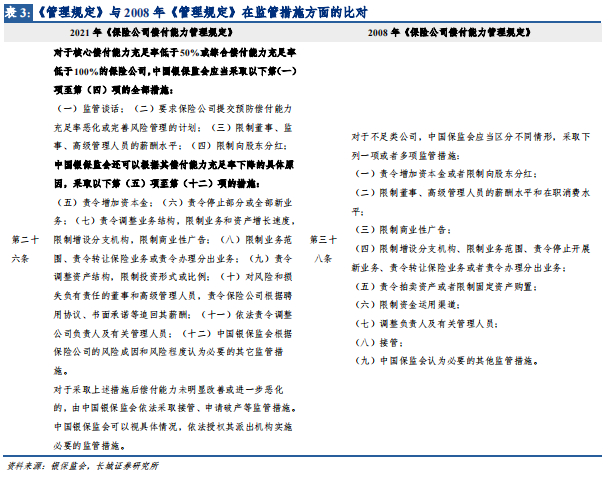 新监管措施被分类为必须采取的措施和根据偿付能力充足率下降的具体原因可选择采取的措施,前者为4项,后者为8项。此外还规定了对于采取上述措施后,险企偿付能力未明显改善或进一步恶化情况,银保监会还可以采取接管、申请破产等监管措施,以进一步强化偿付能力监管的刚性约束。