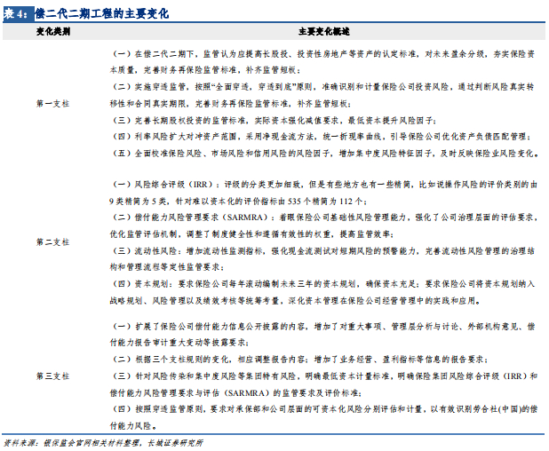 3)第三支柱修订:主要扩展了险企偿付能力信息披露的要求。针对风险传染和集中度风险,明确了最低资本计量标准、保险集团风险综合评级(IRR)和偿付能力风险管理要求与评估(SARMRA)的监管要求及评价标准。