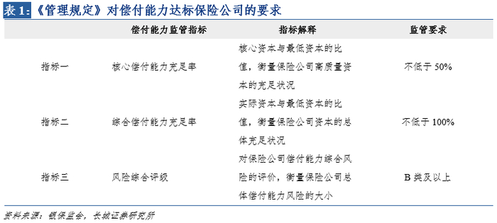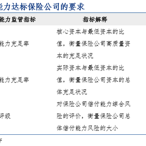 原《管理规定》下的偿付能力监管指标为偿付能力充足率,不低于100%即为偿付能力达标的公司。根据偿二代三支柱监管框架体系,修订后的《管理规定》和《征求意见稿》保持一致,将监管指标扩展为核心偿付能力充足率、综合偿付能力充足率和风险综合评级三个有机联系的指标。具体来说,核心偿付能力充足率,即核心资本与最低资本之比,衡量保险公司高质量资本的充足状况,不得低于50%;综合偿付能力充足率,即实际资本与最低资本之比,衡量保险公司资本的总体充足状况,不得低于100%;风险综合评级衡量保险公司总体偿付能力风险(包括可资本化风险和难以资本化风险)的大小,不得低于B类。不符合上述任意一条的,均属于偿付能力不达标公司。保险业偿付能力监管指标的改进,进一步强化了监管的刚性约束。