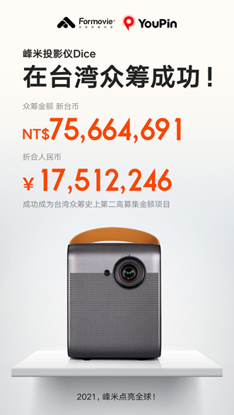 峰米投影仪Dice台湾地区众筹成功,超4300人众筹7500万新台币
