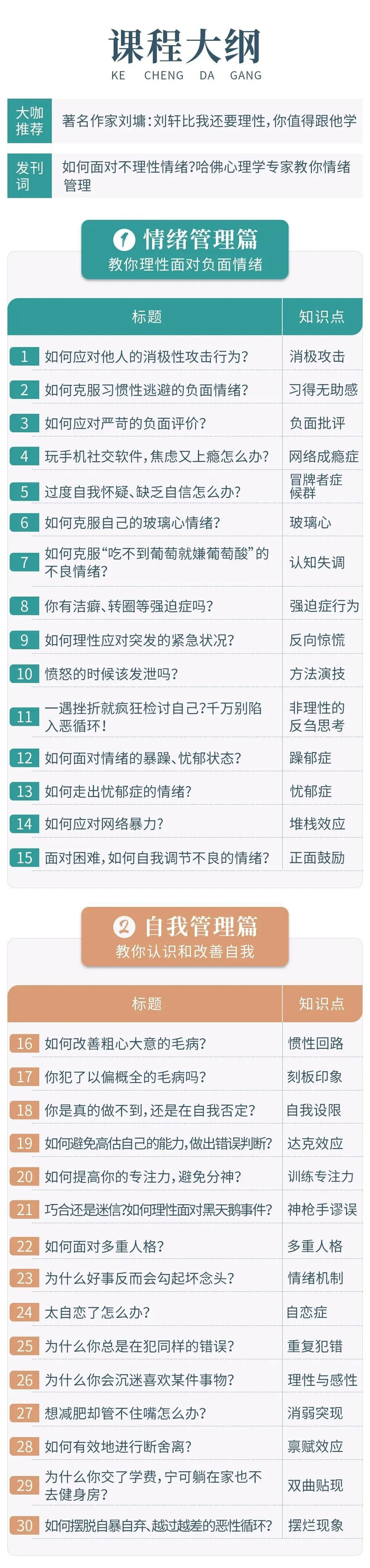 如果你也有焦虑、压抑、愤怒、暴躁等坏情绪,或是面临婚姻关系、婆媳关系、职场人际、亲子关系、自我调节等多方面问题,不妨来听一听这门情绪管理课。