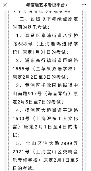 1月26日,考信通艺术考级平台微信公众号推送文章,称部分考点暂缓考试,其中就包括宝山区沪太路的这一考点。
