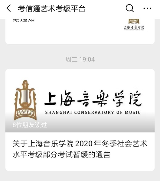 据网上公开资料,考信通艺术考级平台是社会艺术水平考级机构指定的考务信息发布和考级报名公共服务平台,该微信账号运营主体为“上海天下在网信息技术有限公司”。记者注意到,该账号在1月16日上午发布了“上海音乐学院2020年冬季社会艺术水平考级简章 (上海地区)”,文章中写明,报名时间为1月18日至1月25日,器乐专业考试时间为今年1月31日至2月28日。