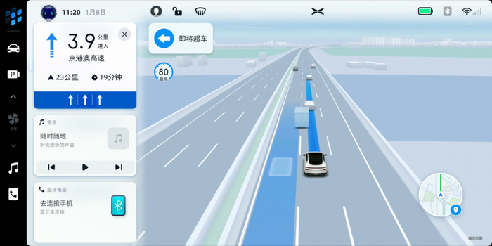 驾驶过程中,在超车行为和执行体验上,小鹏NGP已经非常贴近人类的驾驶技巧。整套超车动作完成的快速干脆,流畅度非常高,超车完成后,车身姿态没有多余的晃动。如果选择手动拨动转向灯杠,小鹏NGP也会自行变道。