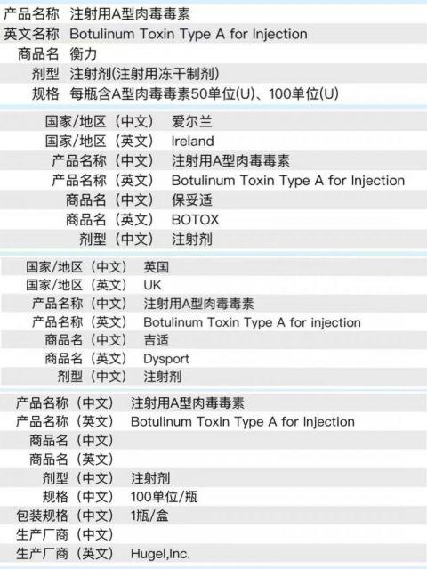 而北青-北京头条记者查询国家药监局相关平台发现,目前我国批准的肉毒素仅有4个品牌,分别是我国生产的衡力,以及进口产品爱尔兰产的保妥适BOTOX、英国产的吉适和韩国企业Hugel的肉毒素产品,后两款均为2020年下半年刚刚获批,目前在国内美容市场上还比较少见。