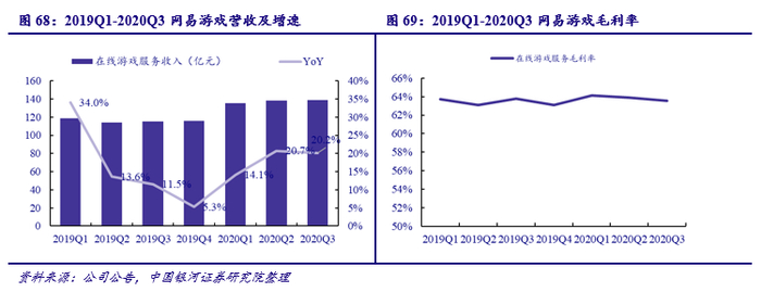 公司概况:网易于2001年成立游戏事业部,是国内首屈一指的游戏研发商及运营商,主攻游戏自研,长线运营能力出色,旗下经典游戏《梦幻西游》、《大话西游》、《《阴阳师》及《率土之滨》等上线多年依然人气不减。同时,网易的产品体系也较为完善,目前已形成一套上至引擎研发、下至品牌营销的成熟产品体系。2019年网易自研游戏收入占比 89%。凭借日益丰富和多元化的游戏产品矩阵及其持久的生命力,网易游戏展现出了强劲的势头。在线游戏作为网易的最大业务收入来源,净收入长期保持稳定增长,毛利润亦常年保持稳定。2020年Q3净收入实现138.6亿元,同比增长20.2%。总体游戏业务毛利实现294.48亿元,毛利率达63.4%。