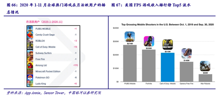 出海表现:具体出海游戏产品方面,帮助腾讯在海外市场站稳脚跟的当属《PUBG MOBILE》(《绝地求生》)。该款游戏由动视和腾讯天美工作室联合开发,2018年3月登陆多个海外市场,不久后便登顶102个国家和地区的免费榜。据Sensor Tower统计,《PUBG》2019年预估收入超过7.76亿美元。截至2020年3月,其海外的总下载量超过5.15亿次。App Annie统计的全球游戏2020年1月-11月的数据排名显示,《PUBG MOBILE》的月活跃用户(MAU)排名第一。基于腾讯在海外发行手游所积累的丰富经验,此后腾讯旗下天美工作室与动视联合开发的另一款游戏《Call of Duty:Mobile》(《使命召唤》手游)亦收获了巨大的成功,2019年上线以来登顶超过150个国家和地区的下载榜,在美上线首月下载量达到1.48亿次,长期位列该地区畅销榜Top 10。根据Sensor Tower的数据,截止至2020年9月后起之秀的《CODM》以2.15亿美元的收入,成为美国收入排名第三的FPS游戏,仅次于《PUBG:M》以及《堡垒之夜》,且三款游戏的收入已经十分接近。