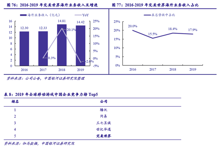 出海表现:完美世界是国内最早进行海外运营的游戏企业之一,自2007年起完美世界曾连续5年蝉联中国游戏出口第一,一度占中国网络游戏出口总额的40%。目前,完美世界游戏在北美洲、欧洲和日本设有全资子公司,并已向海外出口10多款游戏,用户群体覆盖至100多个国家和地区。2019年公司海外收入14.41亿元,同比下滑2.6%,海外游戏收入占游戏业务整体收入的21%。海外业务收入下滑主要系去年同期自研主机游戏《深海迷航》高收入规模导致的高基数影响。过去,公司海外游戏收入主要由端游和主机游戏贡献,手游海外发行规模较小。因此在深耕端游和主机游戏的同时,公司开始重点发力海外手游业务,目前已取得一定成绩。根据伽马数据与SensorTower的数据,2019年完美世界进入全球移动游戏中国企业竞争力榜Top5以及当年12月中国手游发行商收入榜Top10。