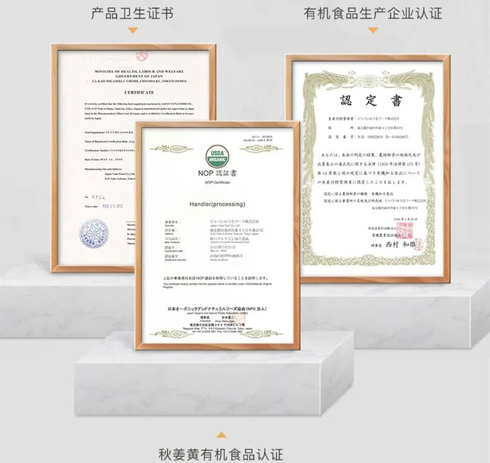 品牌更是被日本官方颁发了各类证书,包括有机庄园的认证、产品卫生证明,以及有机食品的生产企业认证。
