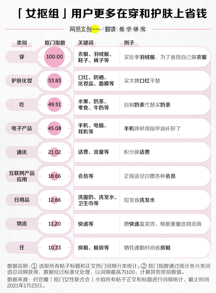 抠门也不耽误女生对外貌的追求,只不过和其他平台种草不同,「女抠组」的成员在护肤化妆产品购买上非常冷静,坚持不过度迷信护肤品,只做基本的补水和防晒。