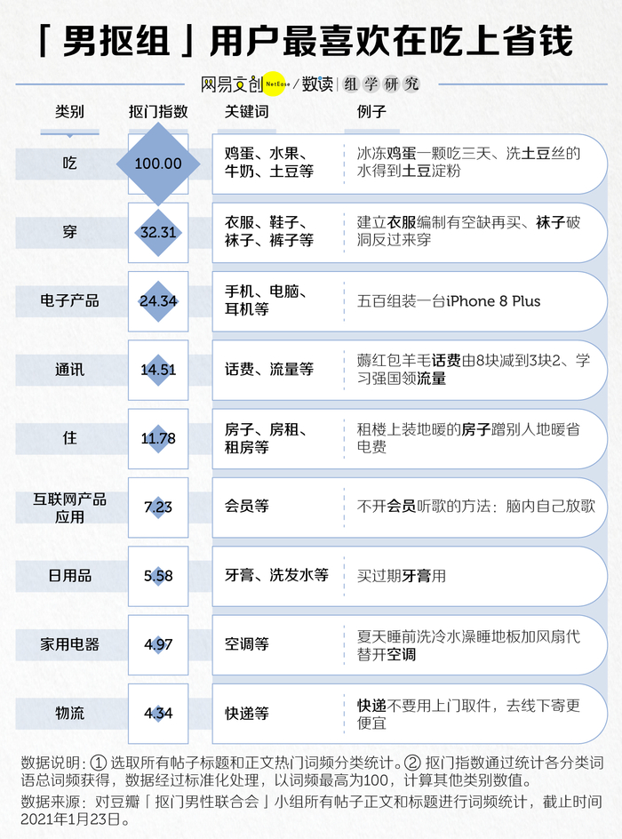 在抠门方法上,抠男、抠女们各有侧重。「抠门男性联合会」是抠门男生的聚集地,他们一门心思降低恩格尔系数,从吃上省钱是最常用的抠门方式。