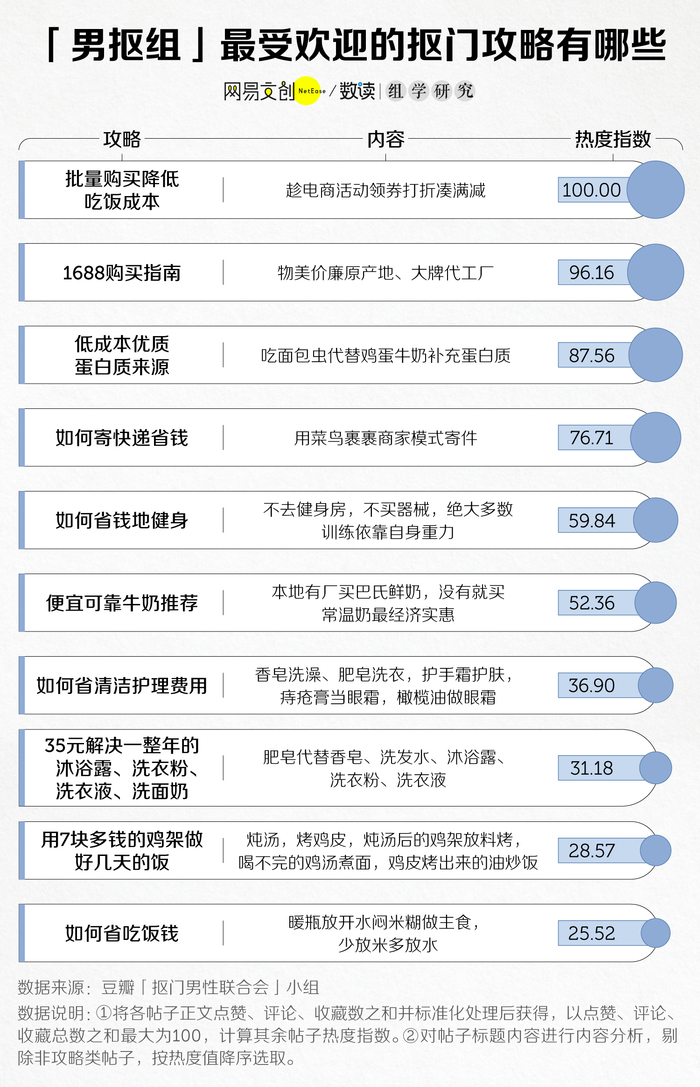 有“抠抠星”发帖精辟地总结了「男抠组」和「女抠组」区别:「女抠组」是“极限挑战,讲究性价比不失精致的买买买”,而「男抠组」是“荒野求生”“活着就行,能自己做就不买”。