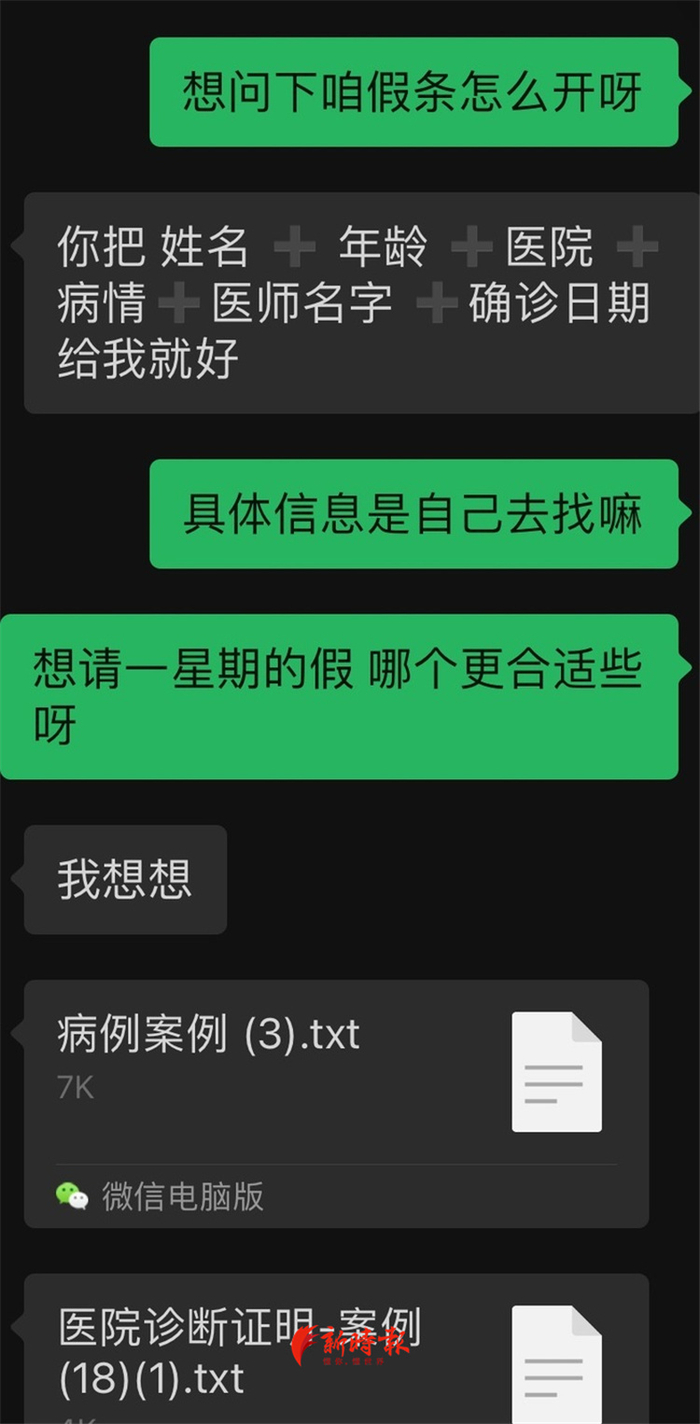 一位“假病假条”价格在200元左右的卖家介绍,“只需提供姓名、年龄、医院、病情、医师名字,以及确诊日期,任何医院都能办。一切都可私人定制。”