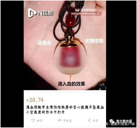 向前追溯,这种“血吊坠”几年前就在电商平台热销,一些年轻的消费者购买后自行刺伤手指“取血”,然后滴入小瓶中,做成项链送给伴侣作为定情信物,或者自己佩戴,认为能辟邪挡灾。
