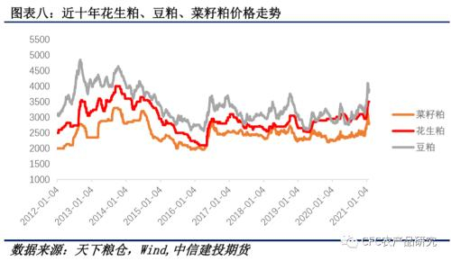 这主要是由于在饲料应用中花生粕、豆粕和菜粕在特定配方中能够被及时调换,一旦出现价差明显超出实际饲养效果的差距,那么就能够刺激饲料企业和养殖企业调整饲料配方,使得价差重新收拢。