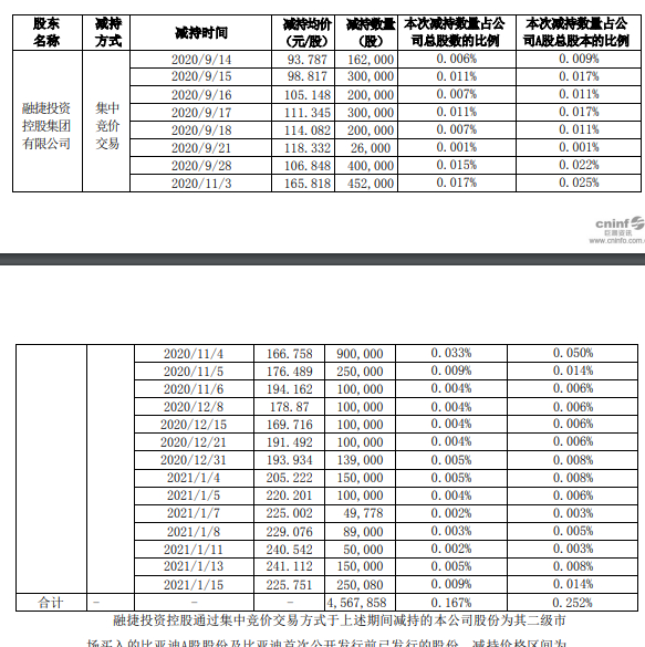 此次吕向阳减持比亚迪股份,正是通过融捷投资实施。按照1月15日发布的公告,从去年9月14日开始到今年1月15日,融捷投资已累计减持20余次,减持数量已过半,减持价格区间为 93.787元/股至241.112元/股。