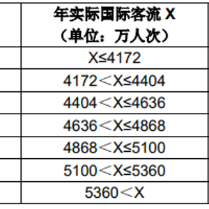 但是如果月实际国际客流超过216万,也就是当月实际国际客流>2019年月均实际国际客流×80%时,“月实收费用”按照“月保底销售提成”收取,“月保底销售提成”按以下公式确定:月保底销售提成=当年保底销售提成÷12个月。其中,“当年保底销售提成”按如下顺序确定:若当年实际国际客流(X)大于下表中当年度对应的客流区间最小值,则取当年度对应的年保底销售提成;若当年实际国际客流(X)小于等于下表中当年度对应的客流区间最小值,则取X所在区间对应的年保底销售提成额。
