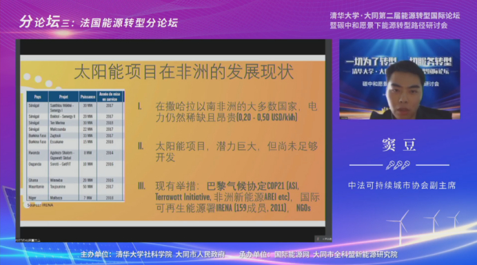 中法城市可持续发展协会副主席窦豆通过一个在非洲实践的具体项目,介绍了在“一带一路”非洲国家能源能够做些什么,以及如何助力城镇电气化。这一项目名称是“太阳能项目SOLERGIE”。