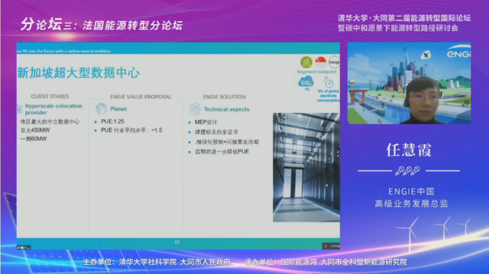 面对严峻挑战,ENGIE集团充分发挥能源企业的优势,在数据中心的服务覆盖了整个链条。怎样助力数据中心实现零碳转型?任慧霞介绍说,第一个环节是选址。ENGIE能源专家会根据数据中心选附近的一些自然条件,因地制宜地对绿色能源供应提供规划设计及投资建设服务。除此之外,ENGIE还配套投资一些数据中心能源存储系统,包括电池储能、氢能和天然气等。
