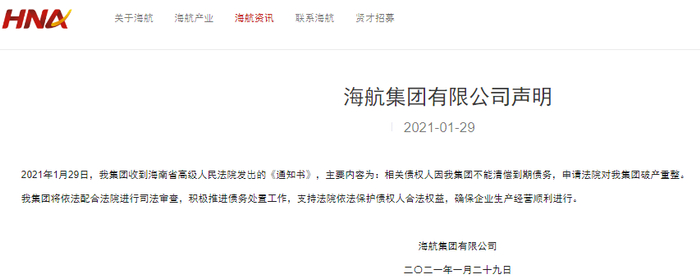 1月29日,海航集团官网和官微以及相关上市公司齐发公告,宣告海航集团走向破产重整的“重生”之路。海航集团表示,将依法配合法院进行司法审查,积极推进债务处置工作,支持法院依法保护债权人合法权益,确保企业生产经营顺利进行。