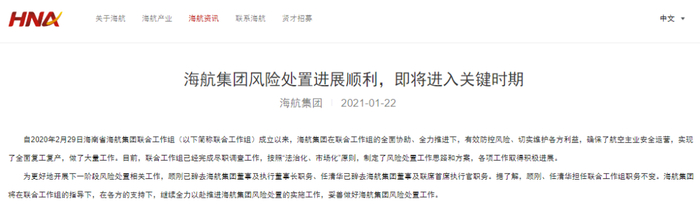 1月22日,海航集团发布了题为《航集团风险处置进展顺利,即将进入关键时期》公告,顾刚辞去海航集团董事及执行董事长职务,任清华辞去海航集团董事及联席首席执行官职务。顾刚、任清华担任联合工作组职务不变。