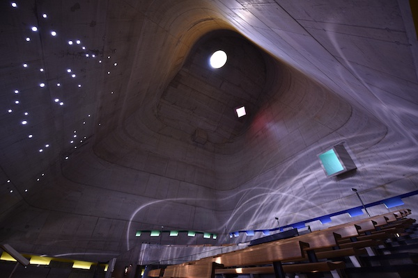 柯布西耶离世41年后,位于法国费尔米尼(Firminy)的遗作圣皮埃尔教堂(Saint-Pierre 图10)于2006年建成。这所教堂用更极致的方式,把光导进室内,构建了星空和光纹。随着阳光角度的改变,投影到墙壁上的光纹像潮水一样涨落波动,并和着星光,让人置身于宇宙和自然的幻像。虽然只是幻想,却也构造了一种回归记忆、自然和传统的思路,那里是故里,也积淀着未来。