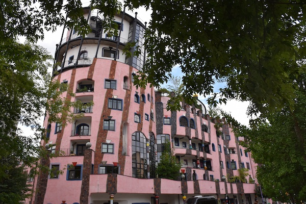 在洪德瓦斯笔下,儿童的纯性浓缩在他们笨拙的笔迹和浓烈的色彩之中。纯色在欧洲的图像学传统中,也有着特殊的寓意之下。尤其是红黄蓝三原色由于其纯粹而成为三位一体的化身。这种童性与色彩的纯性所打造的精神指向,在洪德瓦斯的建筑中形成了一个可以居住、穿行和触摸的真实世界。人们行走在其中,可见镶嵌着马赛克凸凹起伏的庭院,像儿童玩耍过的痕迹,也像微缩的起伏山谷,墙面上也突起着色块,到处是童性的印记。甚至还可以把手伸出窗外,在窗外的墙面上像儿童一样任意涂抹或改造。这出自洪德瓦斯一个名为“窗权”(Fensterrecht)的观念,目的在于美的自我实现,伸手就能触及自己的世界:“居民必须有把手伸出窗外的权力,并在手所能及的范围内改造窗子的边框。”除此之外,洪德瓦斯还提出了另外一种名为“树义务(Baumpflicht)观念, 涉及建筑与自然的关联。两者共同构成了洪德瓦斯《和平协议》的核心。通过这一协议,洪德瓦斯试图在人居与大自然之间构建平衡,在他看来,只有通过这一《和平协议》,“我们才能够在这世上幸存。”洪德瓦斯的绿色城堡无疑是这一协议下的产物。城堡由建筑物和植物组成。城堡中的植物并不是今天建筑商所宣传的绿化,而是一种与城堡建筑物相互融合的自然元素。绿色城堡的植物在各处生长,有时组成秘径,有时像山丘,有时候在阳台的底部蔓延,有的直接从建筑体中的生长,仿佛扎根于悬崖峭壁的树木,构建了一种与建筑相依的自然生态。从特定角度看去,绿色城堡甚至像一个隐藏在山林中的童话世界。