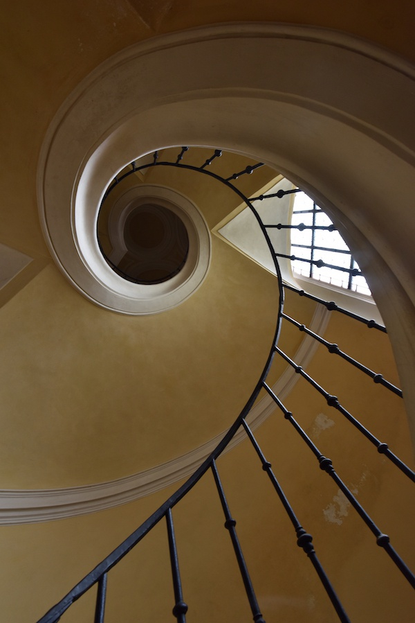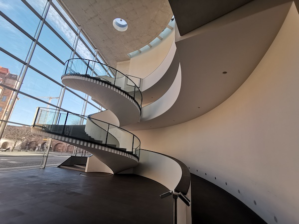 纽伦堡新博物馆的螺形楼梯的也有着特定的意义指向。这个楼梯并非如传统建筑,为狭窄的空间所做,而是立于一处开放的空间盘旋而上,与周围的直线形成视觉上的曲直对比。在高高的天顶之上,可见一个圆形的开口,天光从中倾泻而下。这里无疑又让人想起古罗马时代的万神庙,但与万神庙完全不一样的是,新博物馆天顶上的开口与旋梯并合在一起,更像是一条通往过去或未来的通道。