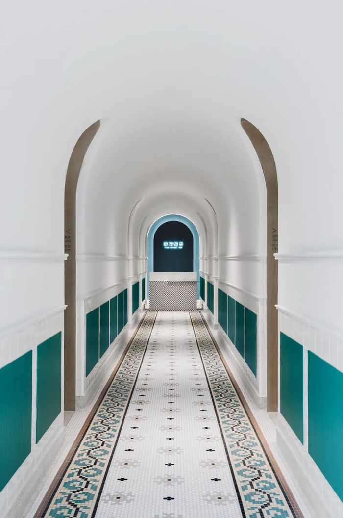 门厅隧道优美的地砖、洗石子墙角,以及波浪面护墙板经过复原,与新元素相结合,穿游在廊道和厢房之间。空间中大量运用圆弧曲线,以东西方共有的经典建筑形态拱门营造出柔和优雅的艺术氛围。