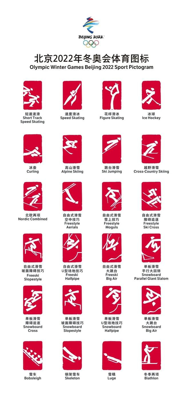 北京冬奥会和冬残奥会体育图标被称为“小红人”,是将书法与篆刻巧妙结合。中国文字在秦代和汉代主要以大篆和小篆为主,字体本身是象形文字,与冰雪运动跳跃的感觉类似。30枚冬奥会体育图标,都是以中国汉字为灵感来源,用篆刻艺术来呈现。体育图标的主色调来源于北京冬奥色彩系统中的主色之一霞光红,也是传统印泥的颜色朱砂色。