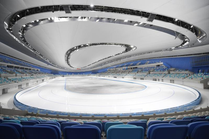 国家速滑馆“冰丝带”首次制冰取得成功。新华社发