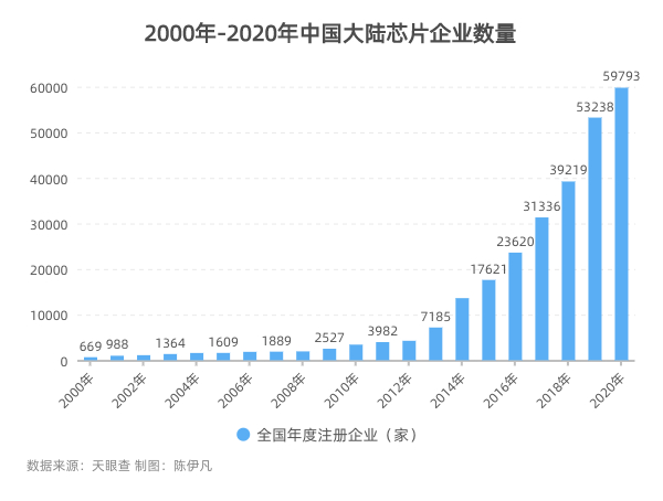 与全球半导体行业走向相反的是,中国半导体行业目前正在经历相对无序的大规模野蛮生长。根据天眼查数据,2020年注册在案的芯片企业有59793家,将近2014年的将近5倍,是10年前的10倍之多,2010年,这个数字是3427家。