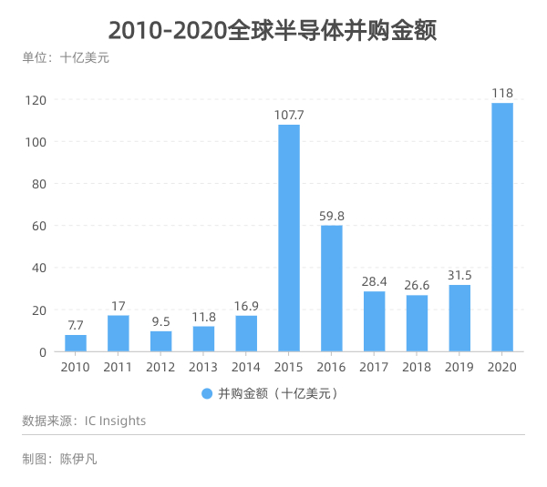 美国时间1月12日,第三方分析咨询机构IC Insights发布最新报告,2020年全球半导体收购和并购总值达到1180亿美元,超出了2015年的1077亿美元。