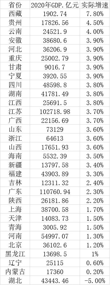 各省份2020年实际增速
