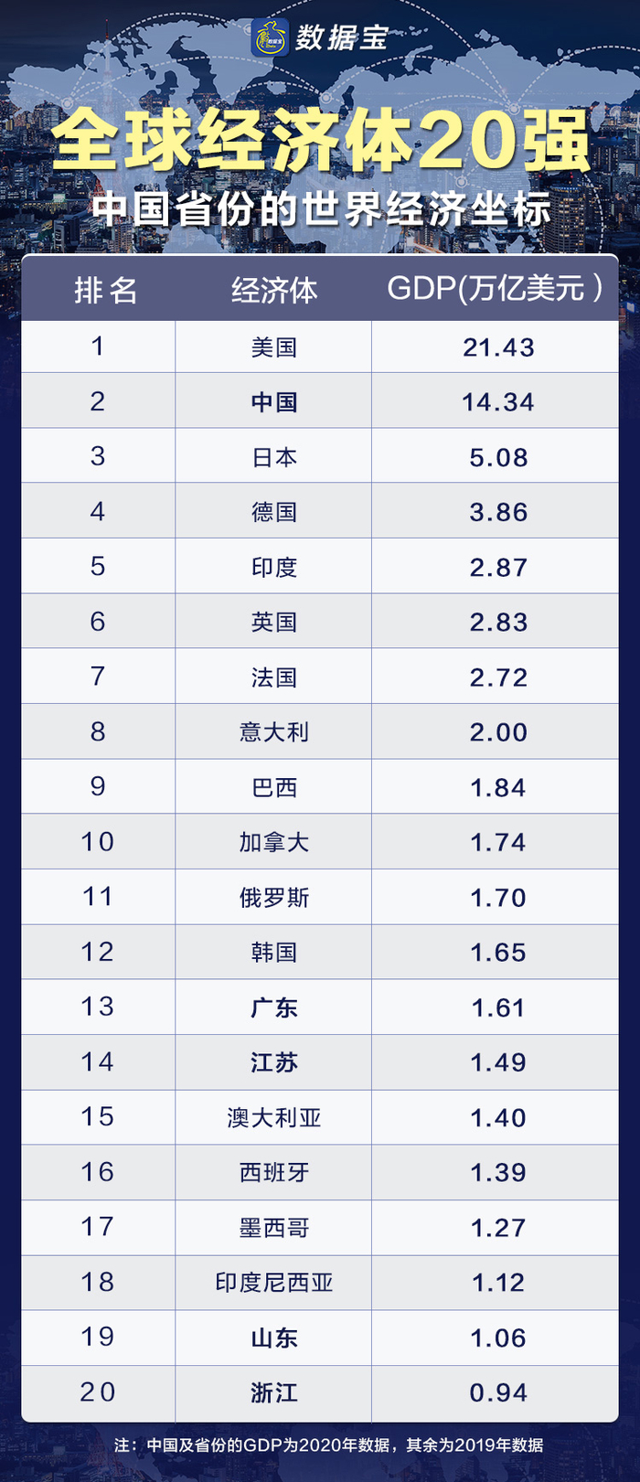 作为在全国排名第三、第四的省份,山东省和浙江省的成绩单同样令人欣喜,GDP排名也可挤进全球经济体二十强,分列第19、20名。