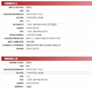 据中国执行信息公开网显示,因高希希旗下霍尔果斯嘉乐股权投资管理有限公司(以下简称霍尔果斯嘉乐公司)与皮某的纠纷一案,高希希(原名:高西西)目前被广州市天河区人民法院列为失信被执行人,执行标的约3600万元。除被列为失信被执行人之外,高希希还被法院立案执行限制消费。