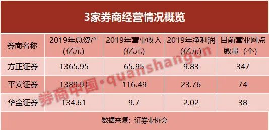 但在营业部数量方面,方正证券因其本身,以及后续又收购和整合了泰阳证券和民族证券,拥有丰富的网点资源。截至今年1月29日,方正证券共有347个营业部;平安证券只有74个;华金证券最少,仅有38个。